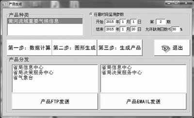 (5) 產品自動生成與分發。 軟件系統根據業務 人員通過人機 交 互 界 面 ( 如 圖 4 所 示) 提 供 的 輸 入 輸出參數( 產 品 種 類、 日 期 等) , 調 用 模 塊 化 的 數 據 計算、圖形生成、產品生成和產品分發等功能, 自動生成圖文并茂的 產 品 文 件 ( word 文 檔) 。 業 務 人 員審閱修改后,可以 選 擇 保 存 和 分 發。 系 統 提 供 FTP 和 Emai1方式的產品分發。